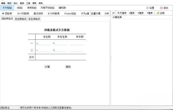 首先选择行数,然后在第一列中输入样本数,在第二列中输入发生数,输入完成后回车或点击计算按钮可计算出X2值,如果为三个以下样本计算中可同时计算出P值范围,如没有P值范围可在帮助菜单或按F2键查询X2值表。